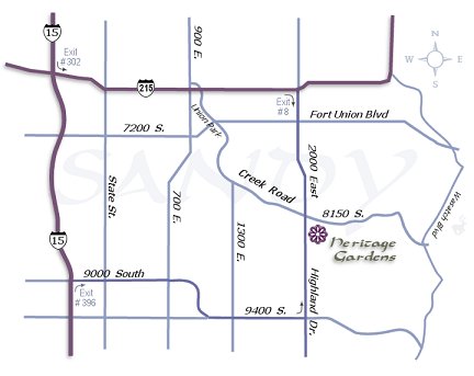 Heritage Gardens Heritage Gardens is located on the southeast corner of 2000 East (also known as Highland Drive or 20th East) and Creek Road. Creek Road is approximately 8150 South. From the North: From I-15, take the 302 exit then I-215 East bound. From I-215 take the 2000 East exit (exit 8) head south for 2.3 mi. (about 20 blocks) to Creek Road. Turn left (east) on Creek Road to get into the parking lot. From the South: From I-15 take the 90th South exit #396 and head east to 2000 East. (At about 10th East, 90th South merges into 9400 South). At 2000 East turn left (north) and follow 2000 East to Creek Road. Heritage Gardens will be at the bottom of the hill, to your right on the corner. Turn right (east) at the intersection to get into the parking lot. |
